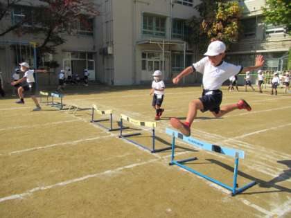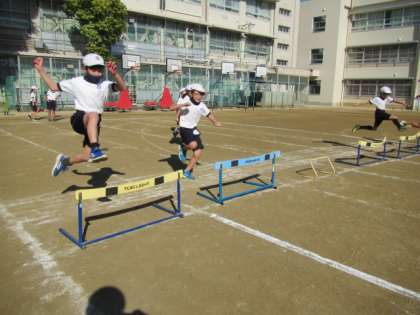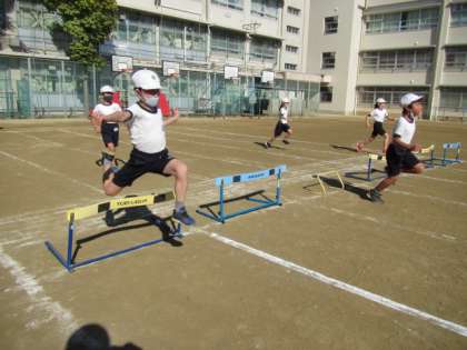 ミニハードル走に取り組んでいます。日に日にスピード感が増してきています。かっこよく走り越していました♪