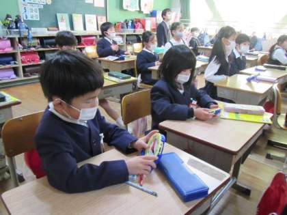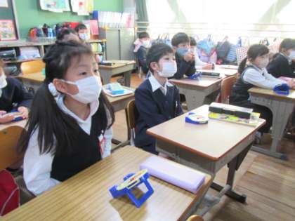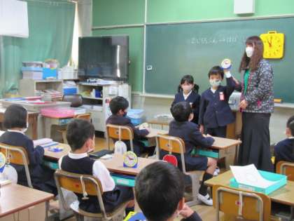 はり時計ではり,2時55分をつくってみよう。3時より手前だから…