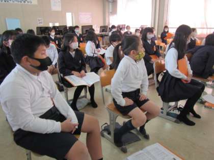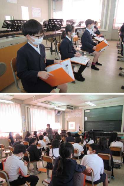 「茶色の小びん」の合奏にチャレンジします。全員,リコーダーでメロディーを担当するのと同時に,もう一ついろんな楽器に分かれ練習します。どの楽器を担当するかを決めています♪