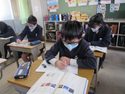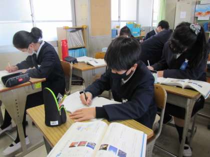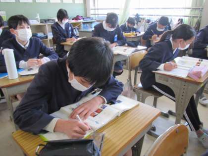 冬の一句を作成中です。季語を上手に使って,冬ならではの情景や思いを表現します。みんながんばって!