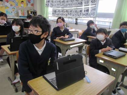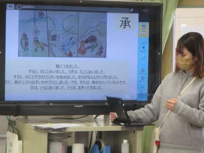 自分が作ったお話を発表しています。起承転結の流れに気をつけながら作りました。作成にあたっては,タブレットをフル活用しました。発表もタブレットを使っています♪