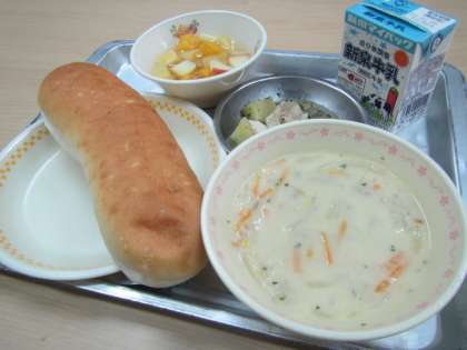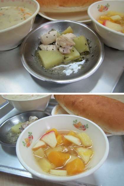 今日はお楽しみ献立です。皆さんの好きなコーンポタージュ・鶏肉の香草焼き・フルーツコンポートです。もうすぐ冬休みです。寒さに負けないように早寝・早起き・朝ご飯,手洗い・うがいをしっかりして,時々窓を開けて空気を入れ替えて,冬休みも元気にすごしましょう。