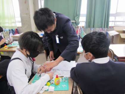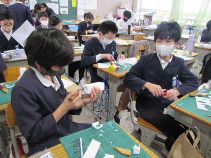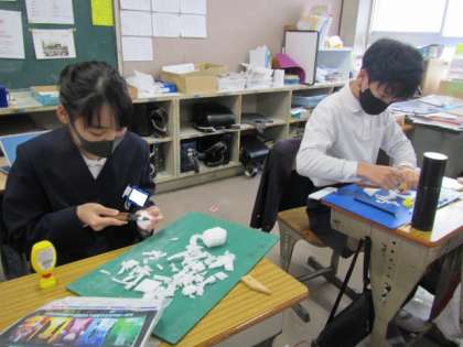 光を当ててその表情を楽しむ立体造形「光のアート」に取り組んでいます。発泡スチロールのような素材を上手に造形しています♪