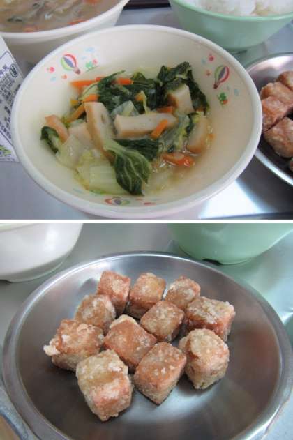 高野豆腐は,豆腐を乾燥させたものです。だし汁で炊くことが多いですが,今日は,片栗粉をまぶして油で揚げました。
