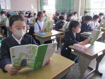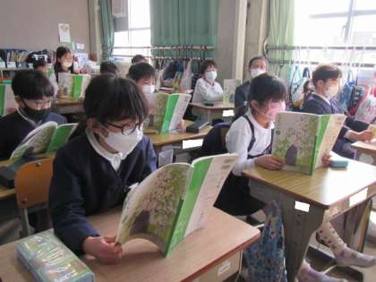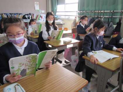 声を合わせて音読しています。学習を進めている「おにごっこ」の音読です。声がそろうと気持ちがいいね♪