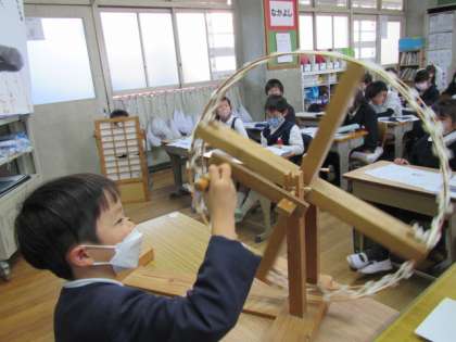 たぬきとおかみさんの気持ちを読み取ります。実際に障子からのぞいてみたり,糸車を回してみたりしながら劇化して考えています♪