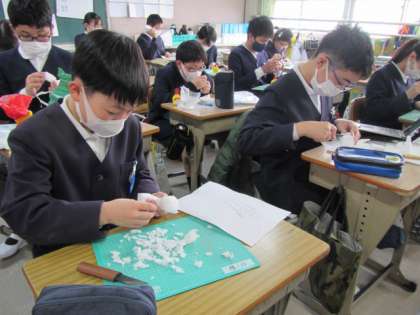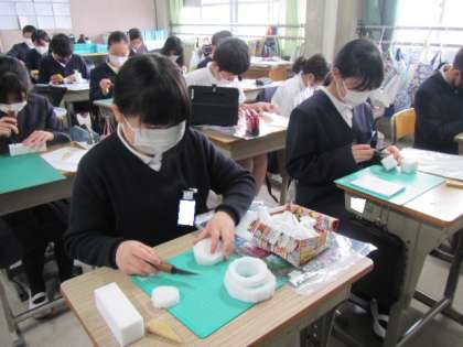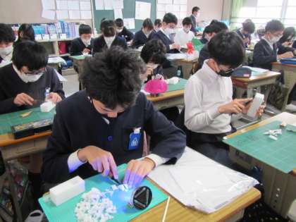 光のアートづくり,がんばっています。立体図形独特の難しさもありますが,その分おもしろさもあるね。みんな,がんばっています♪