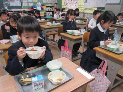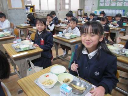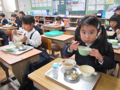 給食の時間が始まりました。今日もおいしくいただきましょう♪