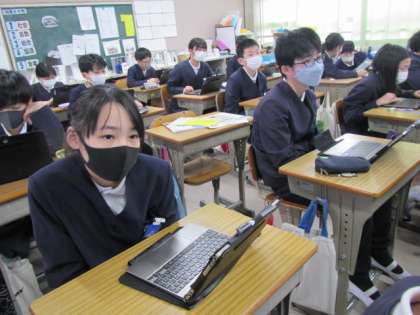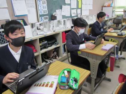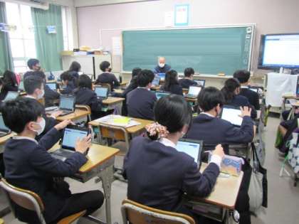 榎っ子 詩 コンテストの投票を行っています。タブレットに送信された各クラスの代表作品を読み,その中から投票します。それぞれの作品にそれぞれのよさがあるから選ぶのがむずかしいね♪