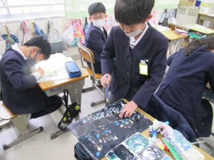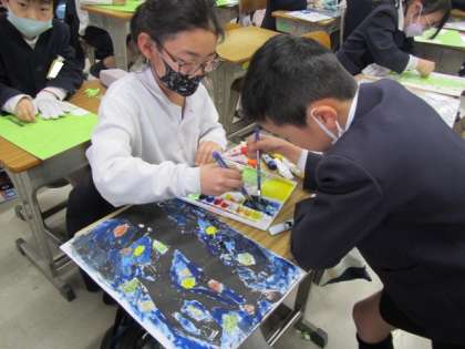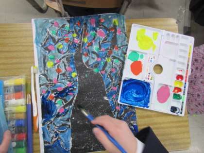 版画でモチモチの木を作成しています。黒いインクで刷り上げて,裏から色を重ねていきます。どんどん教科書のモチモチの木に近づいてきているね♪