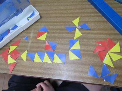 かたちあそびに取り組んでいます。同じ大きさの三角をたくさん使って、いろんな形を作ってみよう♪