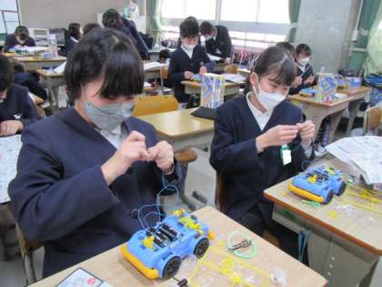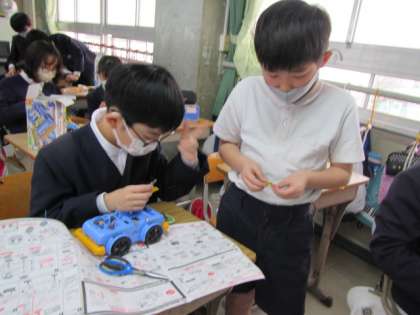 自分で作ったモーターで動く車を作っています。うれしいね♪