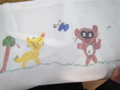1年生で作成した作品を入れる作品袋を作成中です。今すきなものを描いています。かわいい作品袋ばかりです♪
