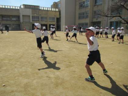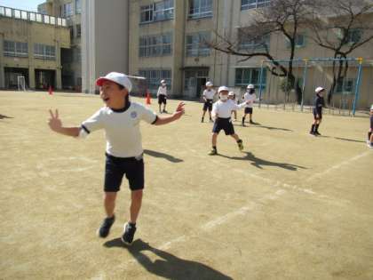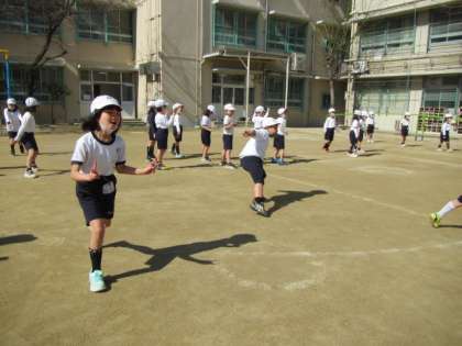 青空の下での体育、気持ちがいいね。ウォーミングアップの折り返し運動に楽しそうに取り組んでいました♪
