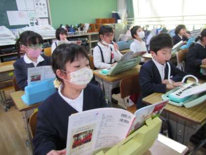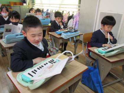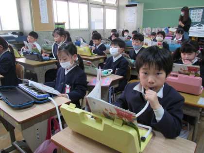 3月20日(月) 1年生音楽「とんくるりん ぱんくるりん」♪