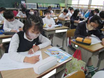 今日は、いろんな国のあいさつを学習しました。みんなで1時間の学習をふりかえっていました。「…の国のあいさつは長くておぼえられませんでした」「それぞれの国で実際に言ったらわかってもらえるかな。試してみたいと思いました」しっかり振り返ることができていました♪