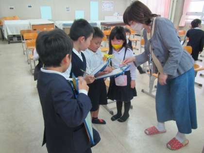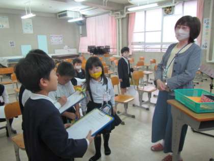 2年生が1年生を連れて学校探検に出る計画を立てています。今日はその事前探検です。いろんな場所に行って、インタビューをしていました♪