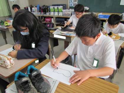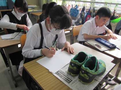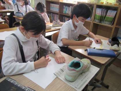 自分の愛用している靴を描きます。下書きなしで、ペンで写生していきます。みんな、集中して取り組んでいます♪
