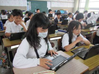 タブレットを使って交流しています。先生からの資料をダウンロードし、自分の考えをまとめ、コンピューター上で提出します。みんな、すごいことができるようになっています♪