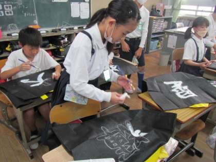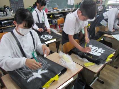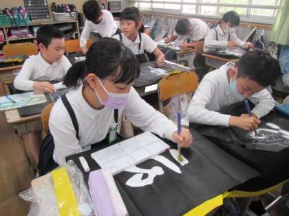 体育参観で羽織る法被(はっぴ)の背中に、自分の大切にしている漢字一字を描きます。それぞれの漢字にどんな思いが込められているのかな♪