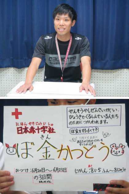 校長先生のお話、生活目標のお話、今日から始まるプール学習のお話、児童会から募金のお話がありました。もりだくさんの全校朝礼となりました♪