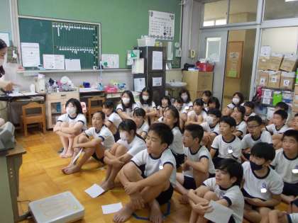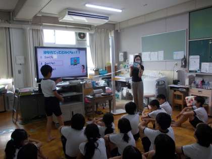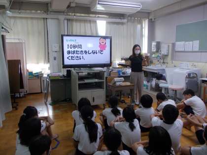 2枚目の写真は,みんなで目の体操をしている写真です。