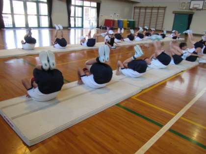 マット運動の学習が始まりました。ウォーミングアップの様子です。まずしっかり体を伸ばしています♪