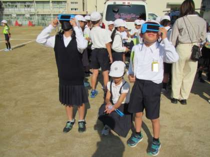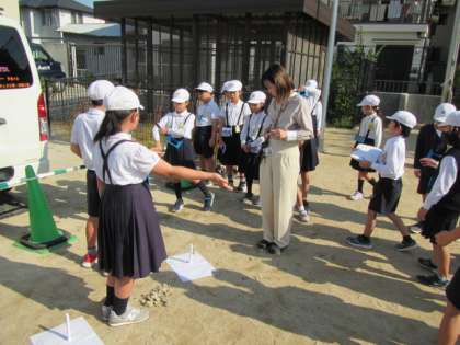 太陽の位置を確認しています。朝、地面から顔を出し、夕方消えてく太陽の動き方を確認します。1時間目の太陽の位置は?みんなで探っていました♪