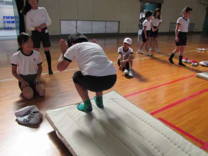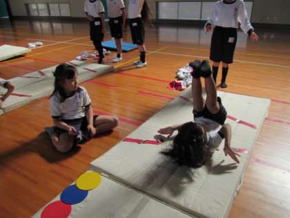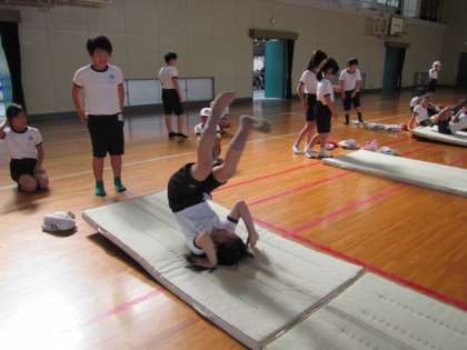 後転の学習です。両足をついた姿勢から始まり、両足でポーズを決めて終わります。グループでアドバイスを送りあいながら取り組んでいました♪