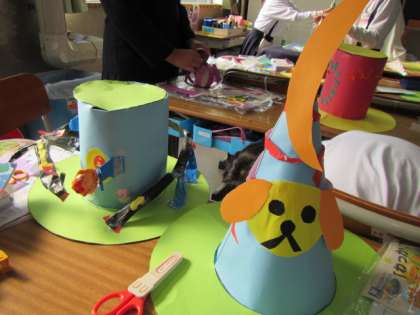 オリジナルハットの作成、がんばっています。今日は自分のテーマにそった飾りつけを進めました♪
