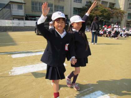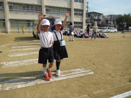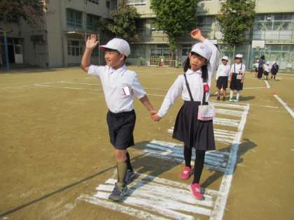 運動場に書かれた道路を使って、実際に、安全に歩く練習をしました♪