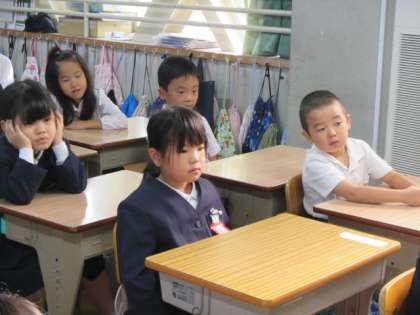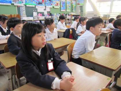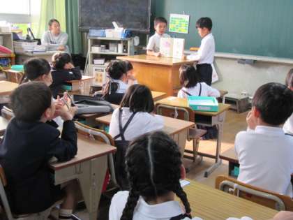 3年生の児童が1年生教室をめぐり、読み聞かせに取り組んでいます。