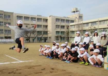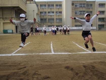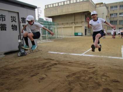 走り幅跳びの学習が始まっています。今日は全力の助走から踏み切ることを大きなめあてとして学習に取り組んでいました♪