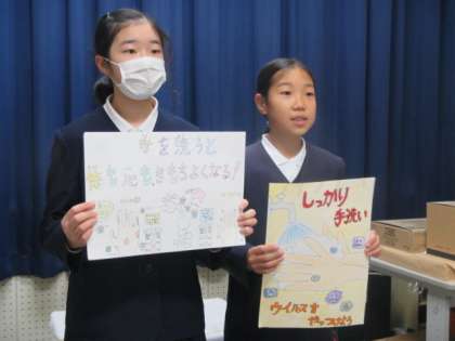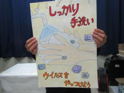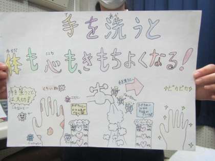 保健委員会からの連絡です。手洗いについてまとめたポスターを掲示しています。実はこのポスターたち、コンクールで「学校奨励賞」をいただいたものです。保健委員会のみなさん、すごい♪