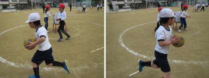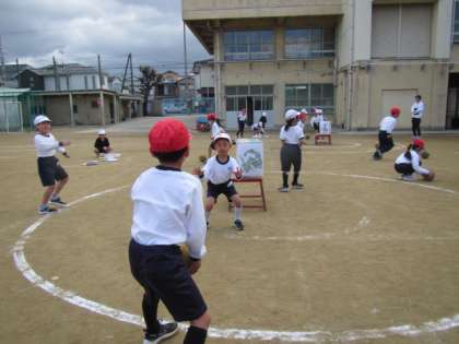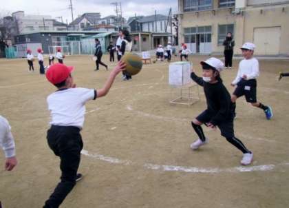 「サークルまとあてゲーム」に取り組んでいます。走ったり、フェイントしたりして自分の力ですきまをつくっている児童もいます。すごい!
