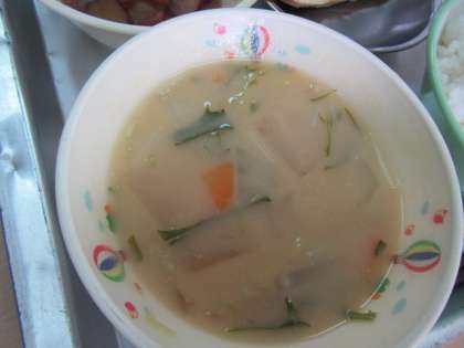 今日は昭和17年ごろ(82年前)の給食です。戦前も戦後も食料がなく、小麦粉を水で練ったすいとんと野菜が入った汁物がよく食べられていました。