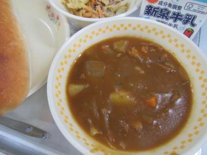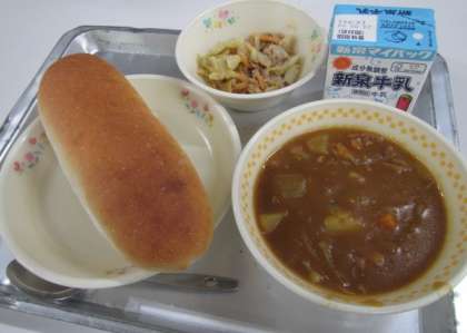 今日は昭和50年より前(49年前)の給食です。戦後、給食の主食はパンだけで、給食にご飯が登場したのは昭和51年以降です。カレーはいつも汁物として出されていました。