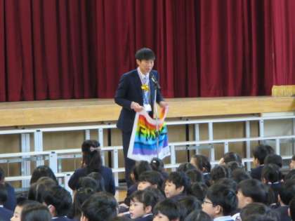 校長先生のお話は昨日参加した大阪マラソンについて。(みんなの応援が心にしみました)