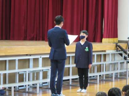 JA共済書道コンクールの表彰、3学期「榎っ子」詩コンクールの発表、表彰がありました