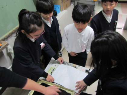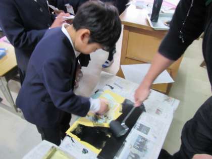 貼り付け版画の印刷に取り組んでいます。みんな、刷り上がった作品にいい表情で見入っていました♪