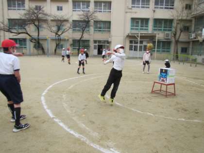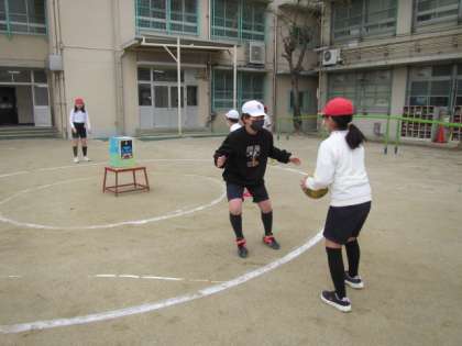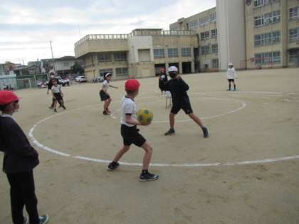 サークルまとあてゲームに取り組んでいました。ボール運動の大切な技能である「すきまをつくる」ことを大きなテーマとしてゲームに取り組んでいました♪