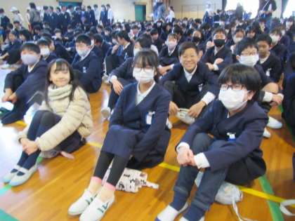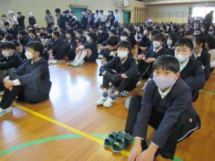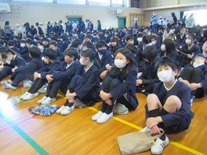 今年度最後、6年生にっては小学校での最後の全校朝礼でした。今日は特別に高学年が前列で集合しています♪