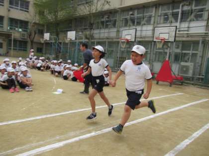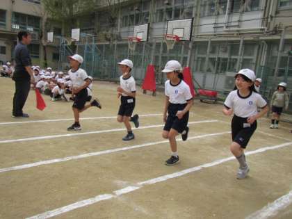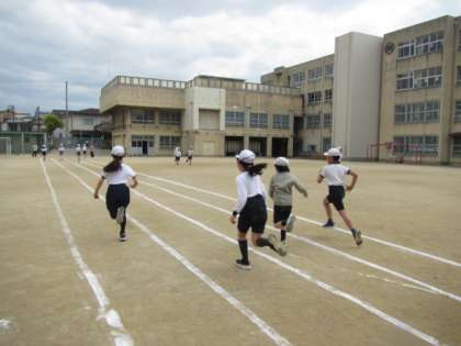 50メートル走のタイム測定に取り組んでいました。全力で走りぬけよう♪