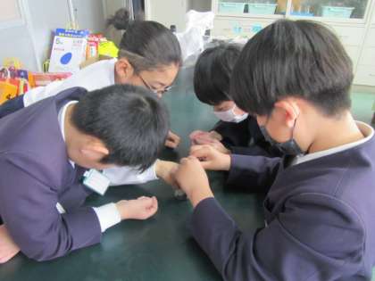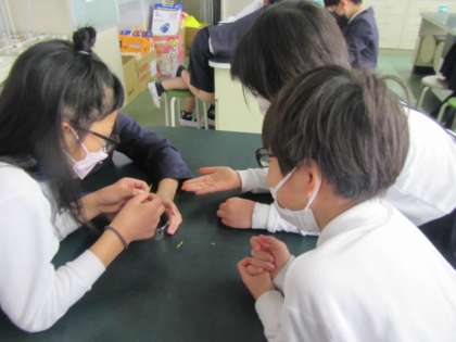 アブラナの花、実、葉、茎をそれぞれくわしく観察します。みんな頭を合わせて集中して取り組んでいました♪