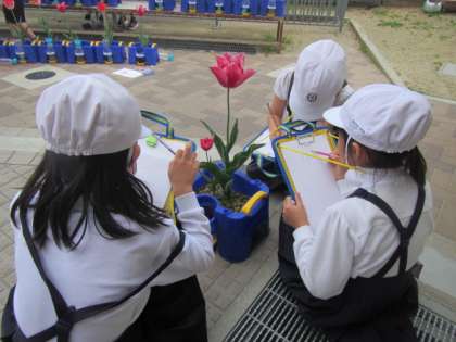 チューリップの観察です。大きなお花が咲きました。もうすでに花びらが落ちている花もあります。「今」の自分のチューリップの姿をしっかり観察しました♪