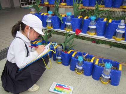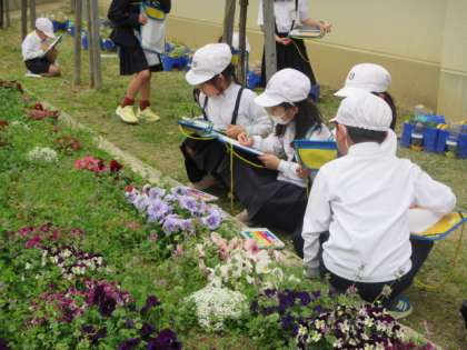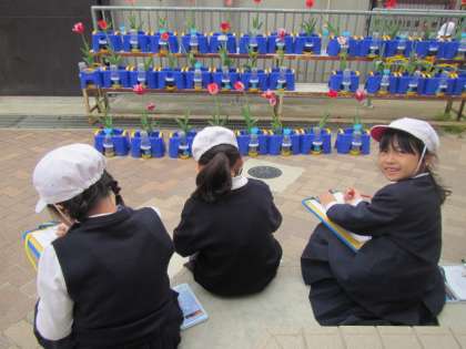 春の草花の様子を観察しています。自分たちが育てたチューリップも立派に咲きましたね♪