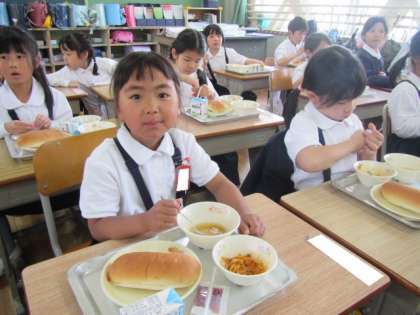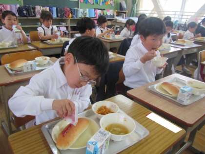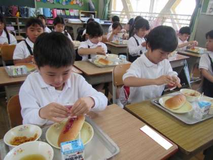 給食の時間が始まりました。今日はコッペパンにジャムをつけて食べます♪