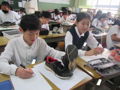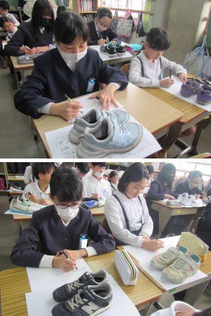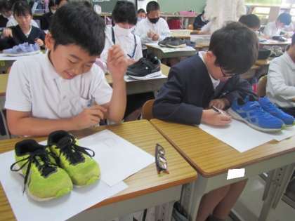 通学靴をしっかり見て描いています。サインペンをゆっくりゆっくりていねいに進めています♪