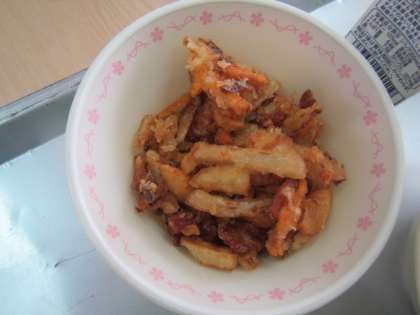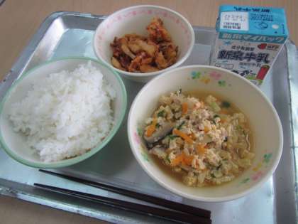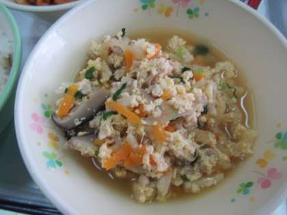 「親子丼」は、鶏肉と卵を使いますが、今日は、豚肉と卵を使っているので「他人丼」です。