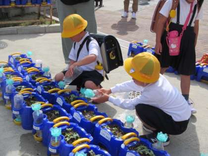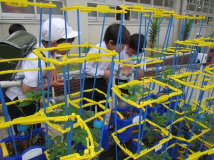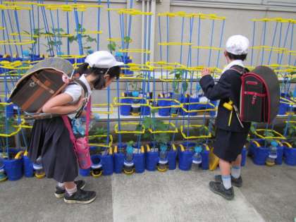 1年生のあさがお、2年生の夏野菜、みんな大切に育てています♪
